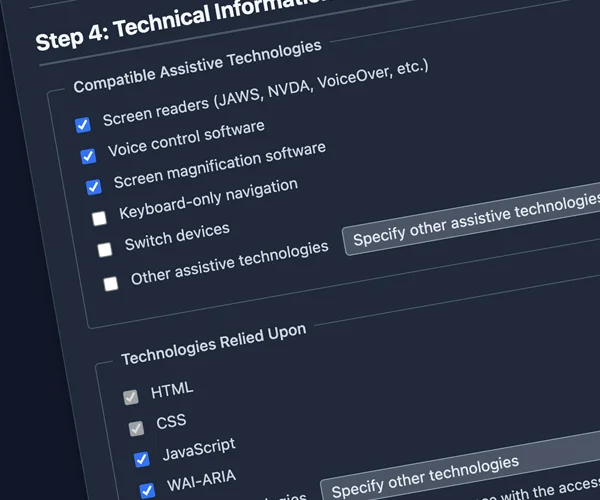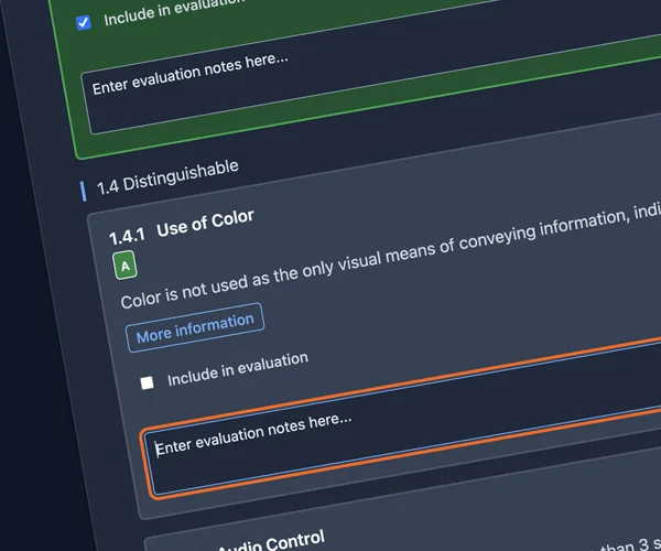 Structured workflows that guide you through every WCAG 2.1 or 2.2 criterion with clarity and purpose. Based on the Web Content Accessibility Guidelines Evaluation Methodology (WCAG-EM).