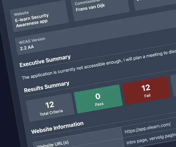 Transform complex WCAG compliance into streamlined workflows. Create comprehensive evaluations and legal accessibility declarations and store them in the cloud. For your own website, or for your clients.